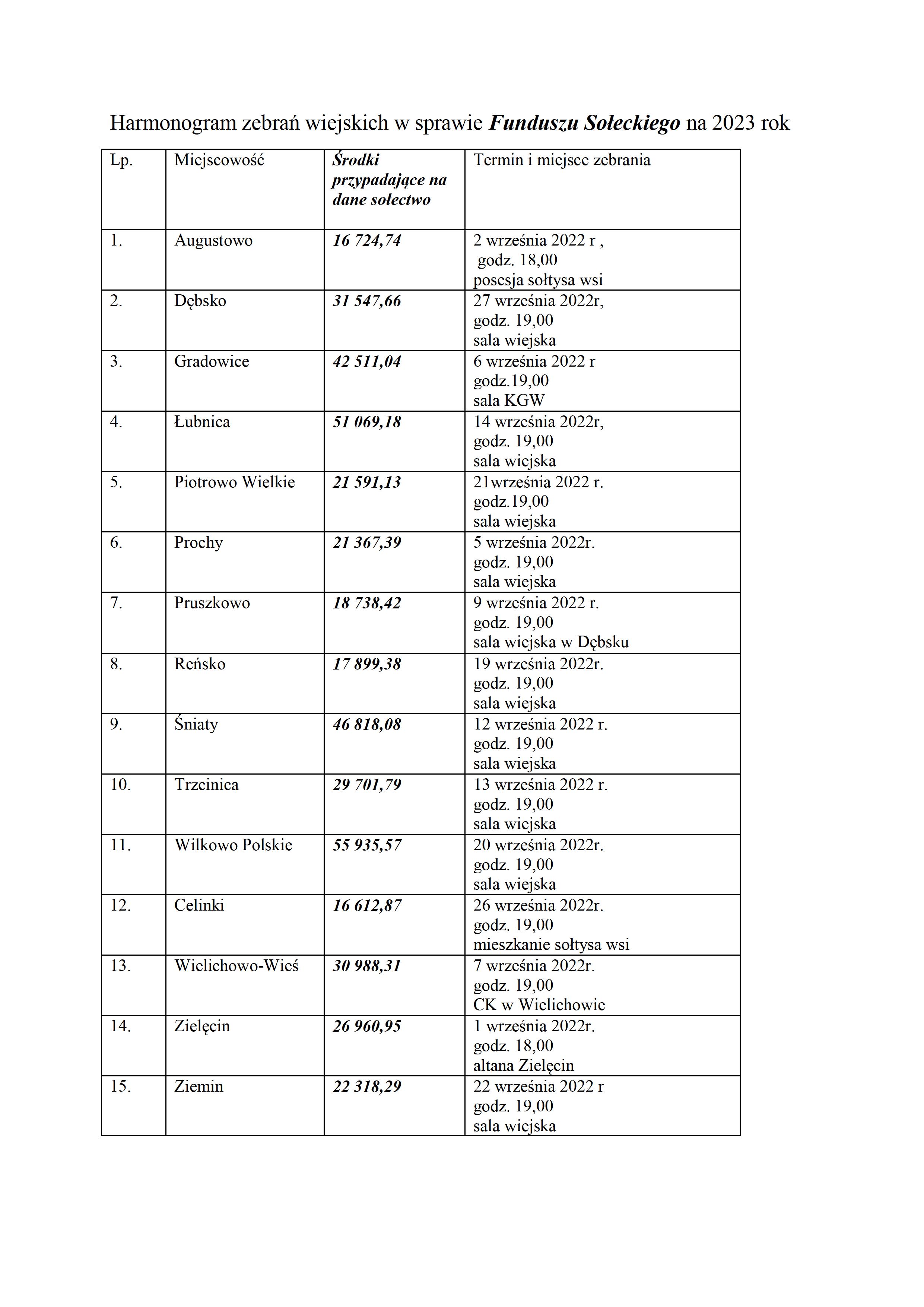 Wszyscy Sołtysi o wysokości funduszu sołeckiego zostali poinformowani pisemnie, a jego przeznaczenie ustalą i zatwierdzą Mieszkańcy poszczególnych wsi na zebraniach wiejskich, które odbędą się zgodnie z przedstawionym poniżej harmonogramem.