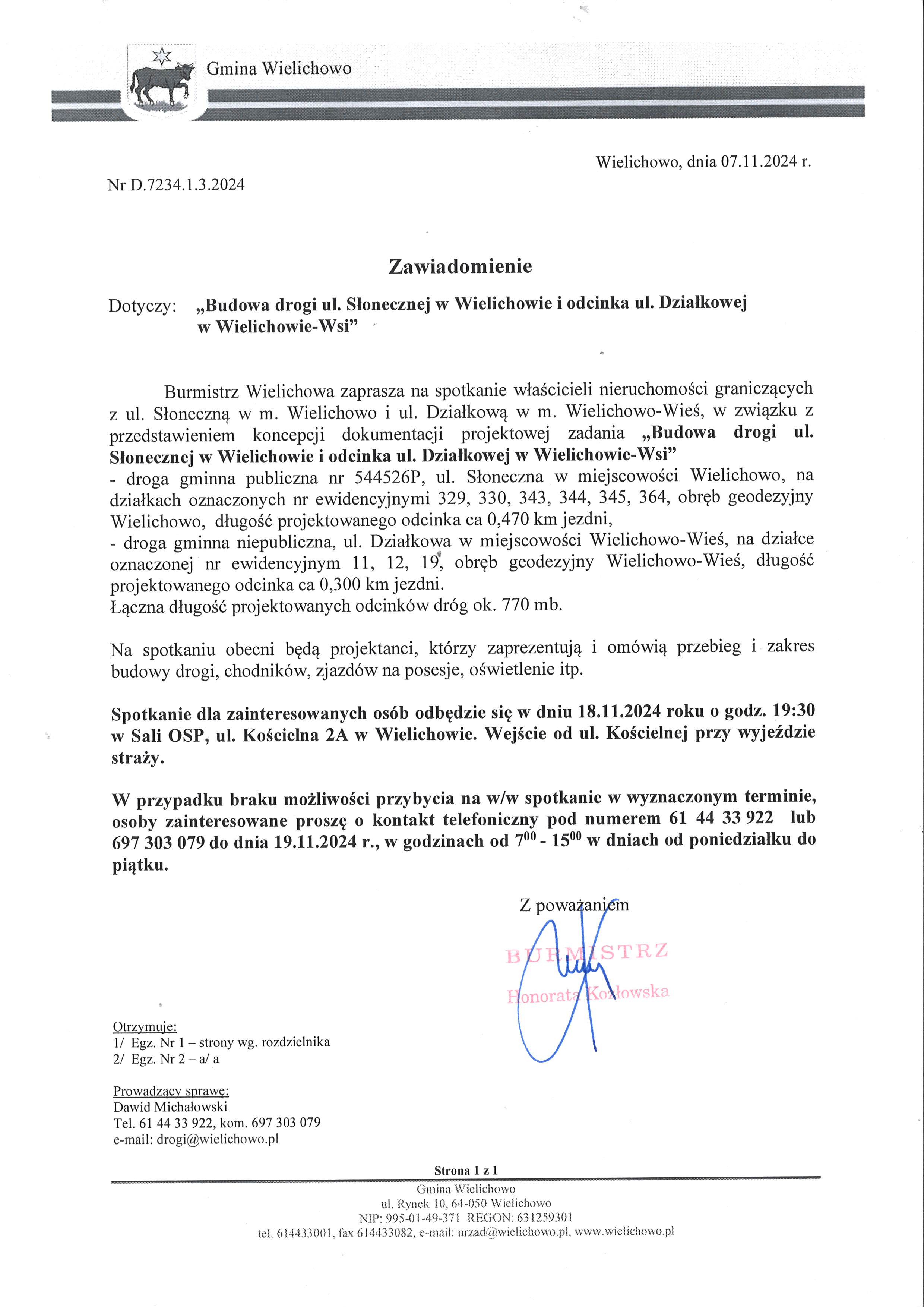Burmistrz Wielichowa zaprasza na spotkanie właścicieli nieruchomości graniczących z ul. Słoneczną w m. Wielichowo i ul. Działkową w m. Wielichowo-Wieś, w związku z przedstawieniem koncepcji dokumentacji projektowej zadania "Budowę dróg ul.Słonecznej w Wielichowie i odcinka ul.Działkowej w Wielichowie-Wsi".